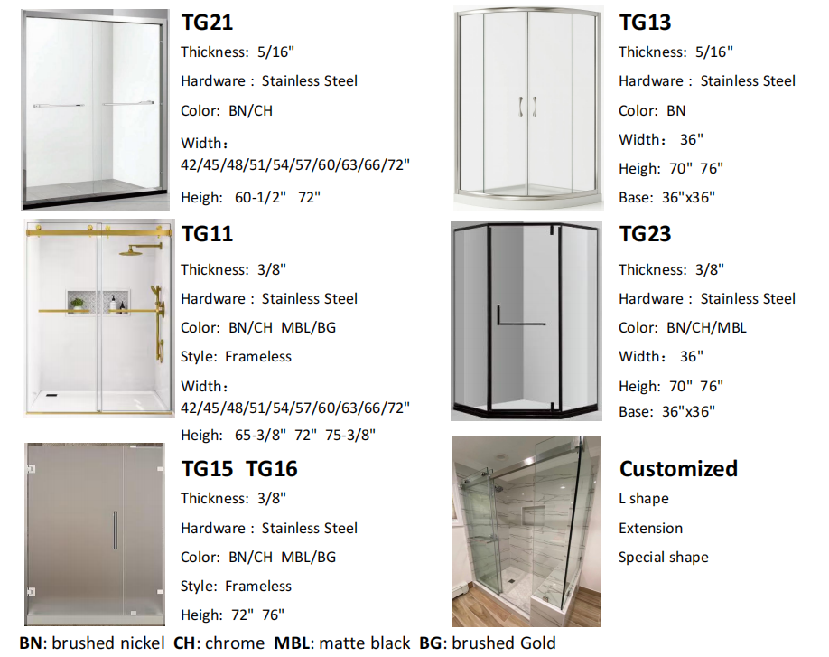 一楼浴室展厅:展出10多款浴室玻璃门,有推拉门,外开门,有框式,无框式。全钢化玻璃,边框有亮光、哑光、金色、黑色,尺寸从21”到108”。提供浴室玻璃门专业定制服务。展出20多款洗手盆柜、镜柜、LED镜柜。洗手盆柜有落地式、墙装式,尺寸从18”至60”。展出30多款名牌,自主品牌水龙头。展出10多款节水马桶,智能马桶。